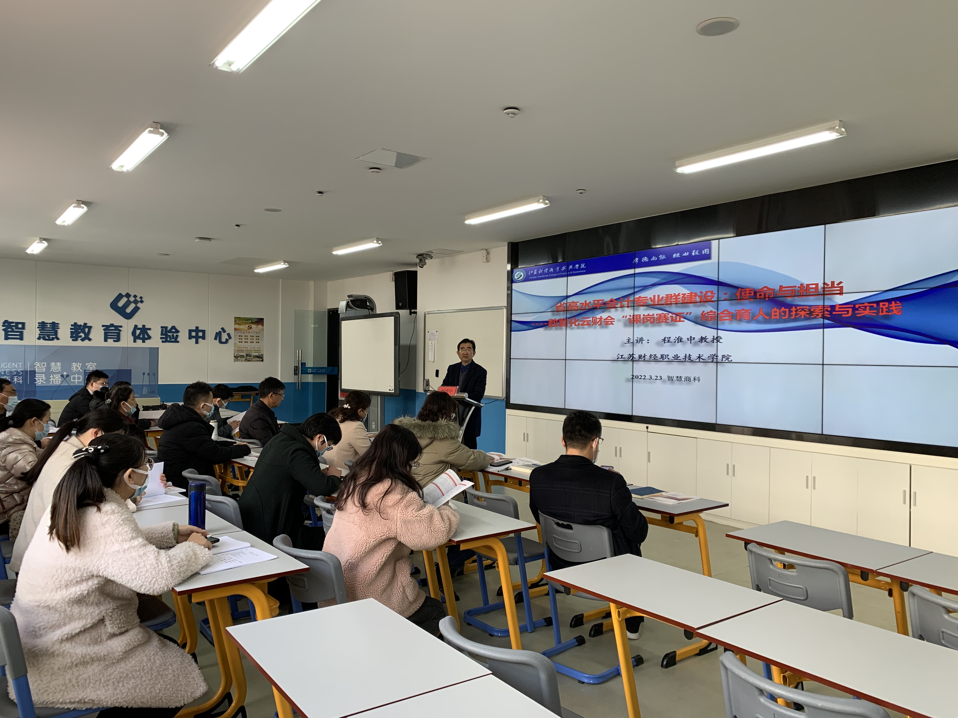 为全面推进学校江苏省中国特色高水平高职学校和高水平专业群建设,推动学校高水平建设高质量发展,3月23日下午,校长程淮中教授在智慧商科综合实训中心智慧教室进行了题为:《使命与担当-----数智化云财会“课岗赛证”融通教改的探索与实践》的专题报告。会计学院领导班子、教研室主任、教授、博士参加了本次活动。