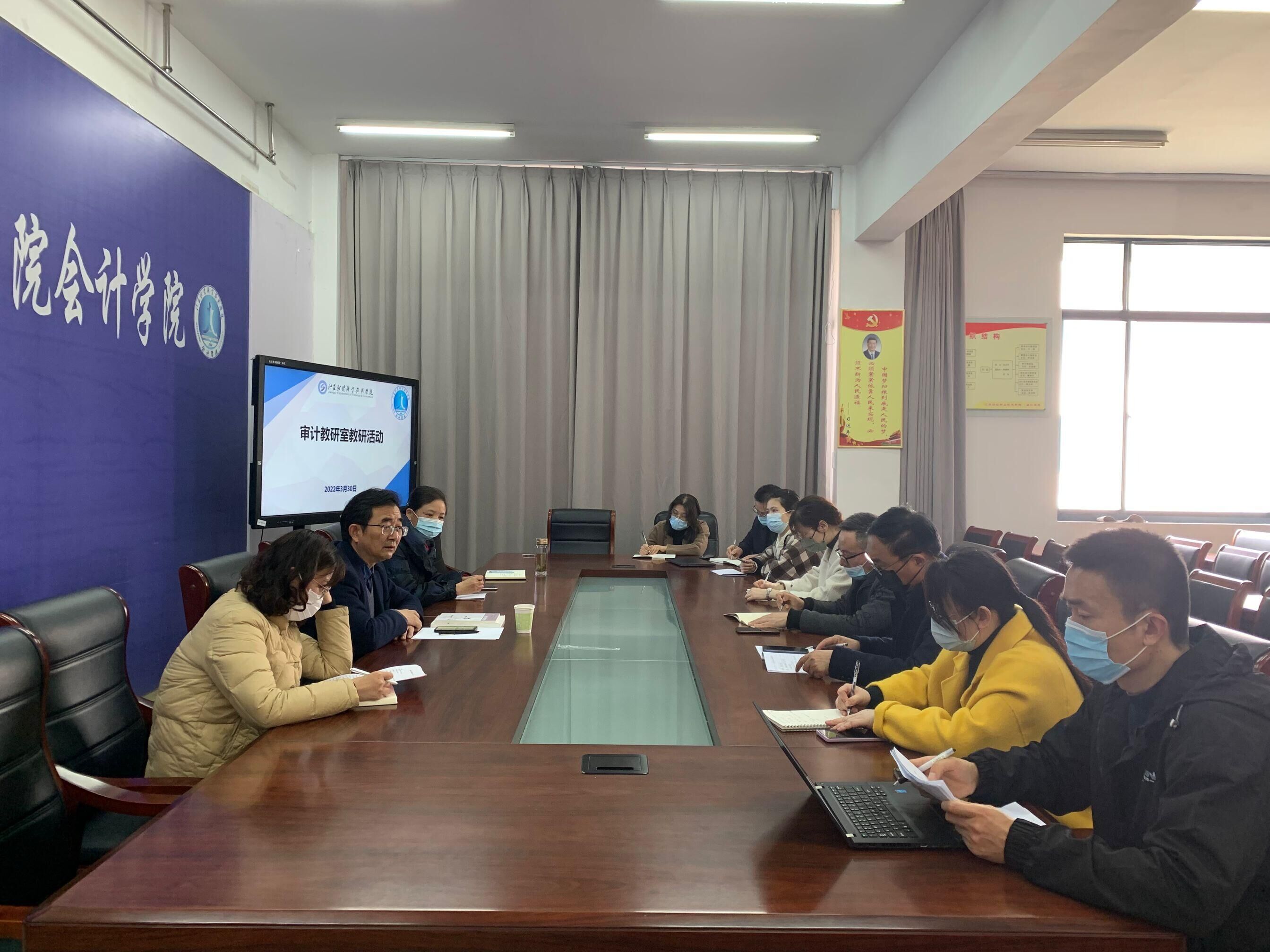 2022年3月30日下午,程淮中校长亲临会计学院,参加审计教研审计教研室组织的教研活动。会计学院副院长郭晓明、李坤,孔德军教授、丁佟倩教授、颜永廷教授以及审计教研室全体教师参加了会议。