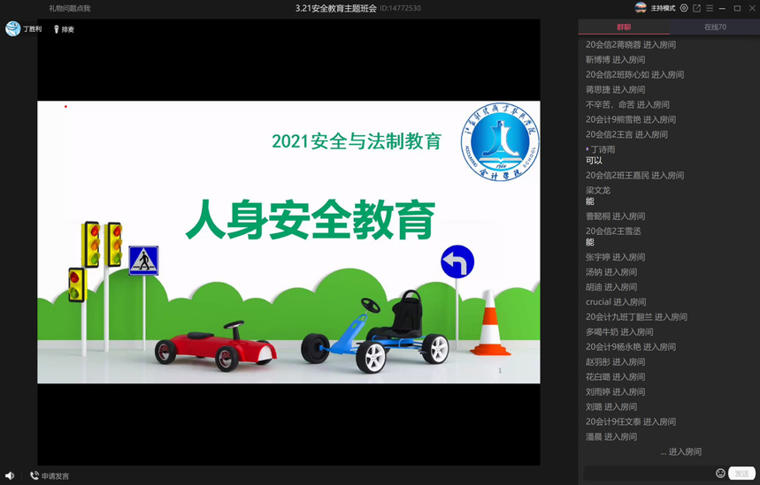 接着,各班班委在线讲解安全教育知识,涉及人身安全、出行安全、交通安全和校园安全常识,让同学们进一步加深对日常生活中“防患于未然”重要性的理解,及时为同学们敲响安全警钟!各班级还在线开展互动环节,同学们通过自我思考、自我剖析,结合自身经历,排查身边的安全隐患,讨论解除这些隐患应该采取的措施,让同学们认识到自身在安全防范方面存在的盲点和不足,从而达到提高同学们安全防范能力目的。