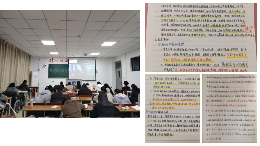 与有肝胆人共事,从无字句处读书。为了更好地了解周恩来先生,我班开展了读书活动。同学们集体观看周恩来系列电影,上网收集资料,阅读有关周恩来的书籍,以手写、电子稿等形式来讲述自己对周恩来总理事迹的体会与感悟,“愿终将相会于中华腾飞时”是我们坚定的回答。