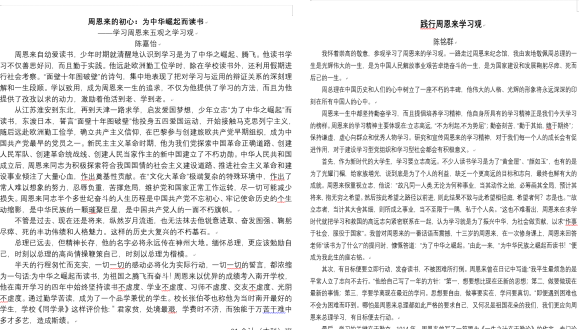 也许班会、征文比赛、读书笔记只是一个个新的起点,从周总理事迹中汲取正能量,我们一直在路上。我们将时刻铭记全心全意为人民服务的宗旨,在全面建设小康社会的伟大实践中,奋楫笃行、履践致远!