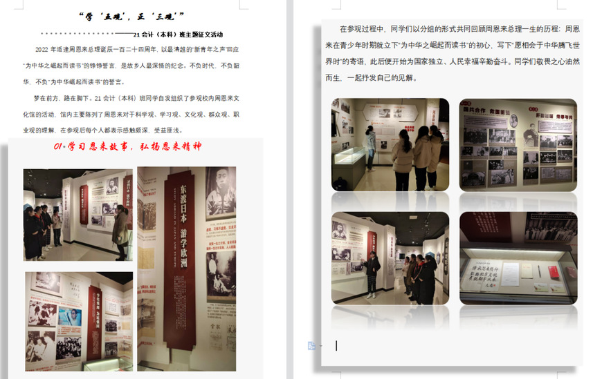 如今周恩来总理离开我们已经四十六年,而他为中华之崛起而读书的远大抱负,为革命和人民无私奉献一生的精神,始终留存在我们心中。至此,会计学院21会计(本科)班开展了“学周知周”相关系列活动。
