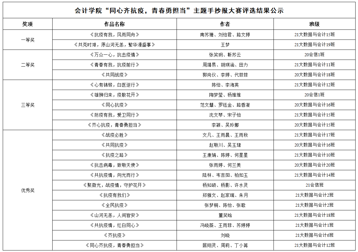 为进一步促进新型冠状病毒肺炎防护知识的宣传,弘扬抗疫先进人物的事迹和精神,传播青春正能量,增强广大青年学生的疫情责任意识和防护意识,会计学院于2022年4月中下旬组织开展了“同心齐抗疫,青春勇担当”主题手抄报大赛并对大赛优秀作品进行了巡展。