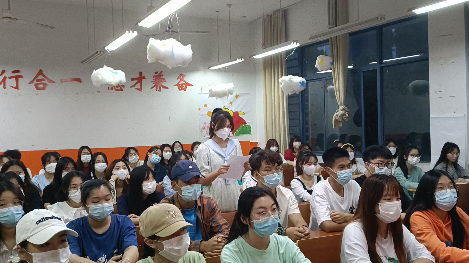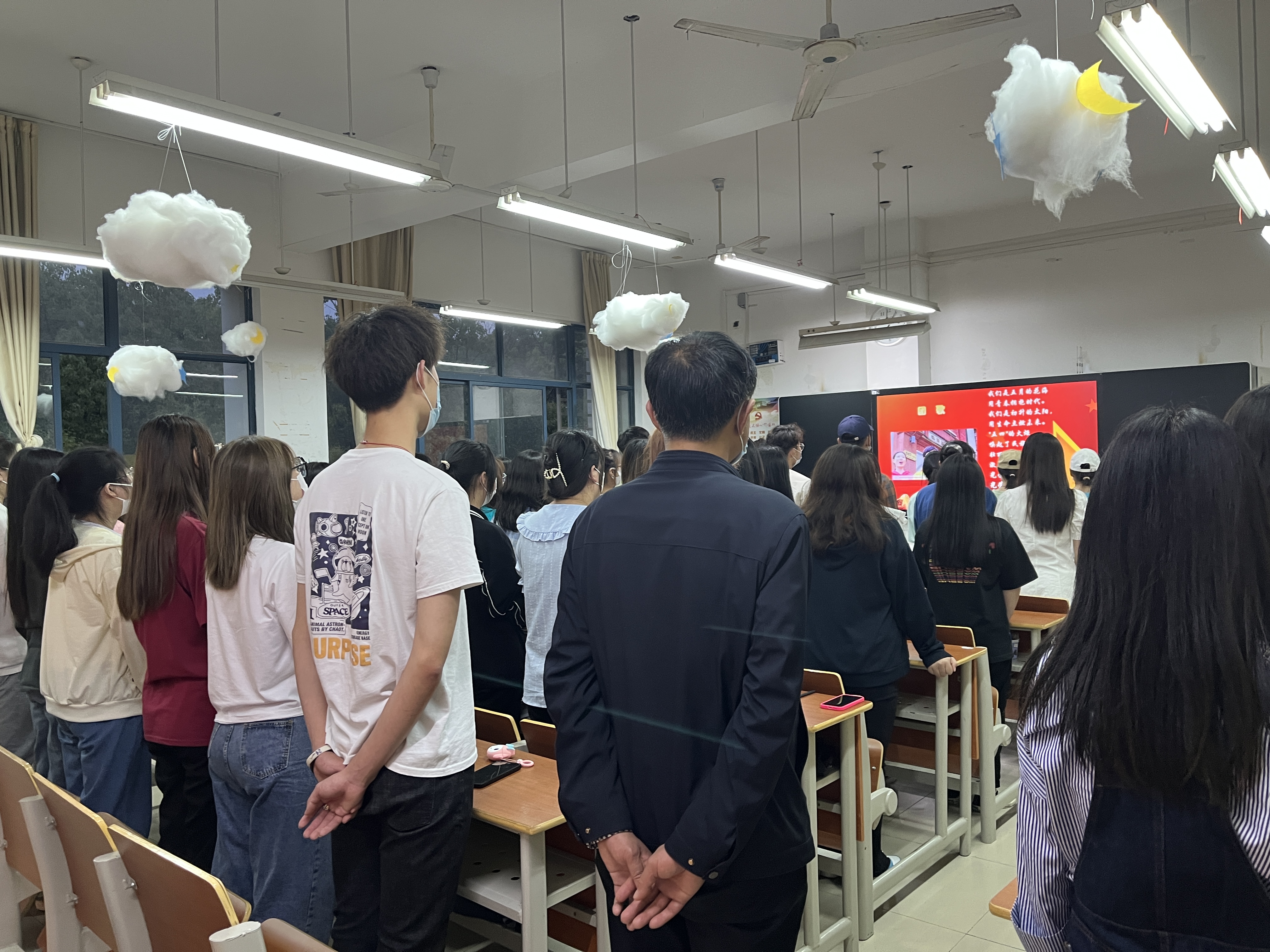 图为邵主任和同学们共唱团歌