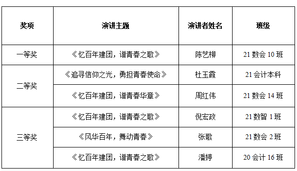 为庆祝建团100周年,教育引导广大青年学生学团史、强信念、跟党走,增强青年团员们的使命感、责任感,弘扬革命先辈的事迹和精神,会计学院于4月-5月组织开展了“忆百年建团,谱青春华章”演讲大赛,带领青年同学们重温百年团史,传承红色基因,勇担青春使命,展现新时代青年风采。