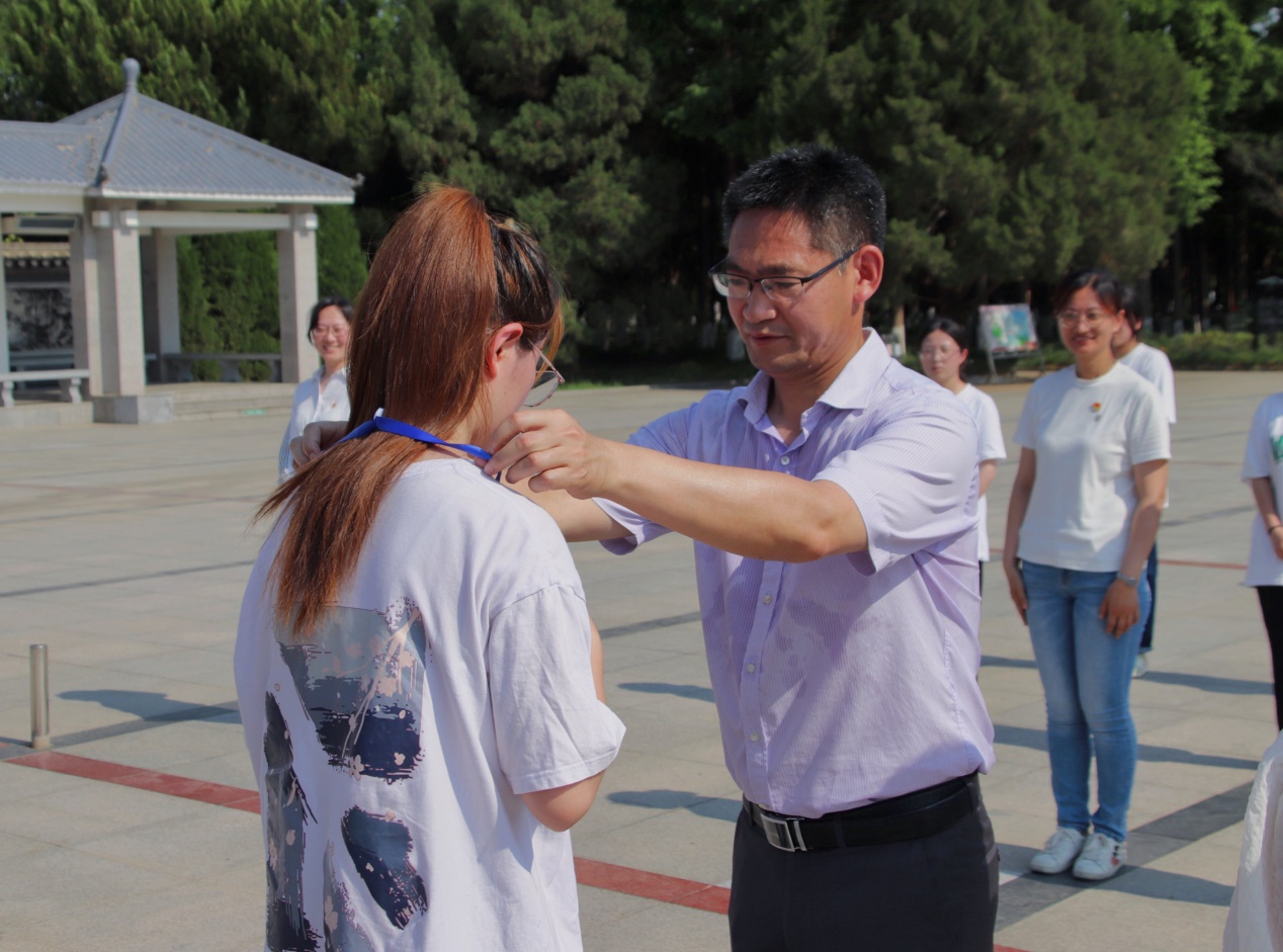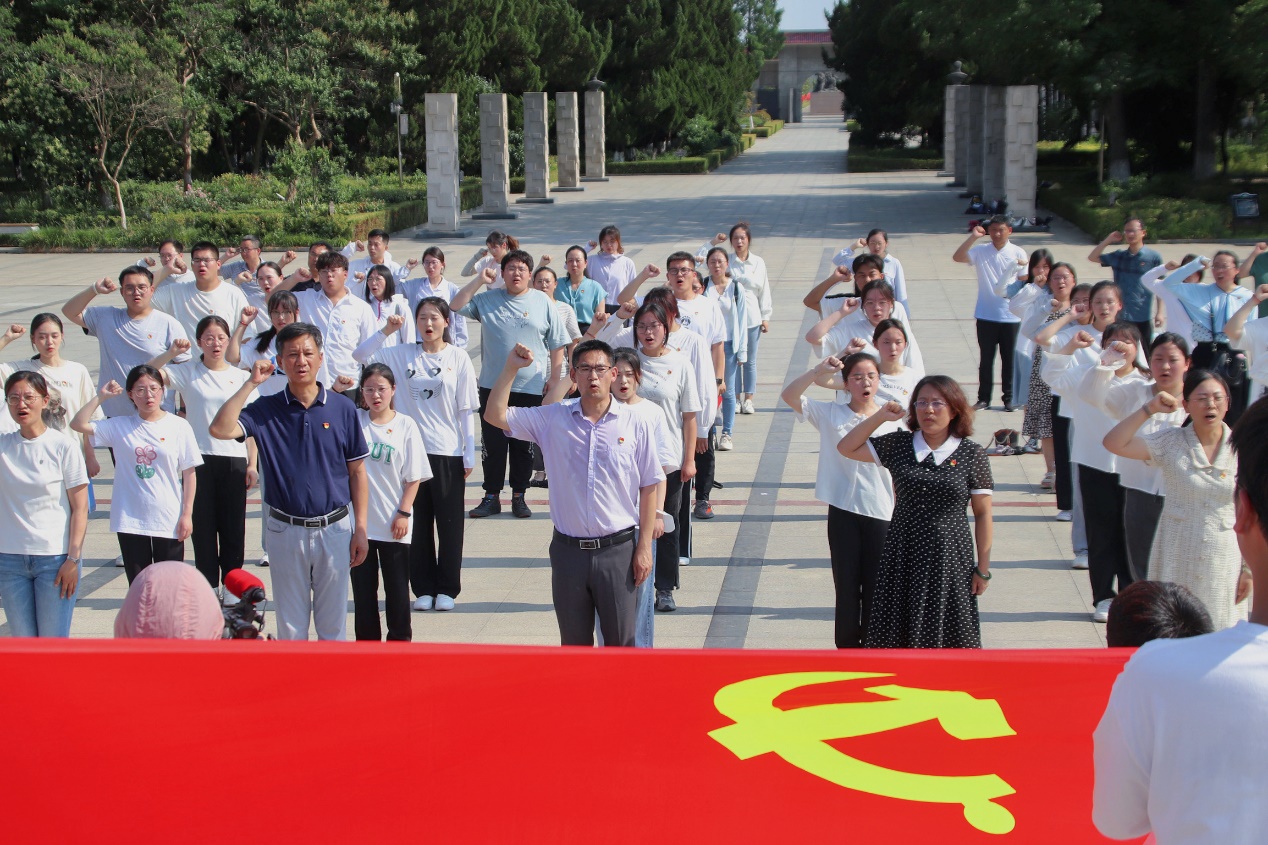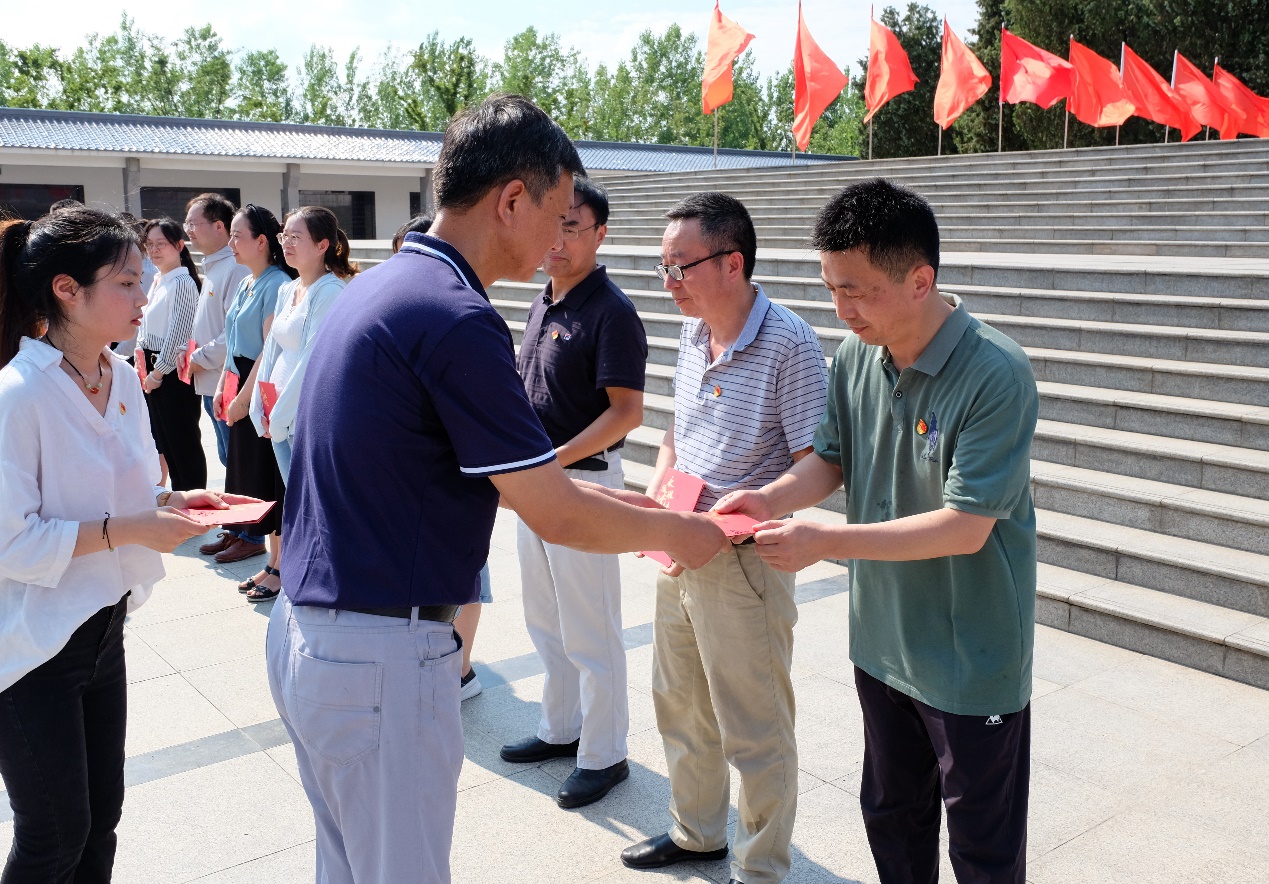 纪念碑前,全体党员胸佩党徽,聆听党员代表重温入党志愿,回顾入党时的难忘经历和坚定决心。院长张卫平、纪委委员李星彤为今年新发展党员挂身份牌,别上党徽。党总支书记罗斌、院长张卫平向部分老党员赠送政治生日贺卡。在学生第二党支部书记袁飞带领下,全体党员面对党旗庄严宣誓,以实际行动践行“四重四亮”。党总支书记罗斌指出,党员同志要继承先烈遗志,弘扬民族精神,把老一辈无产阶级革命家开创的事业薪火相传,发扬光大,要充分发挥党员的先锋模范作用,锐意进取、改革创新、团结奋斗、勇毅前行。随后全体党员瞻仰了刘老庄八十二烈士纪念馆。