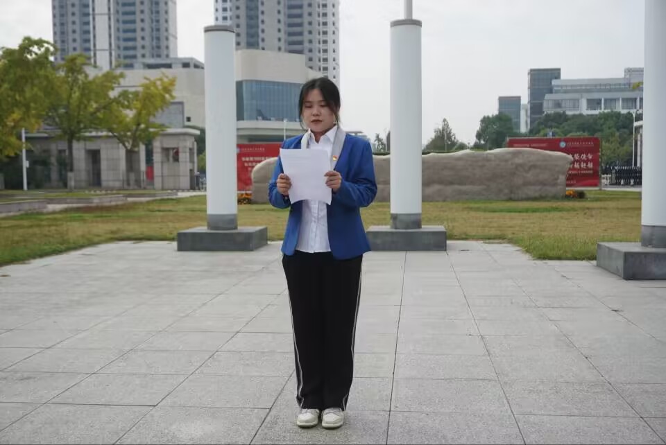 升国旗仪式开始后,广场上响起了庄严的国歌声,五星红旗迎风伸展着升向半空,全场师生都肃立向国旗行注目礼,高唱国歌。国歌响毕,五星红旗已经在广场的阳光里升到了旗杆的最顶端,红旗在朝阳的映照下,显得格外鲜艳,格外美丽。最后,学生党员顾蓉以“勇挑时代大梁,展现时代担当”为题发表感言。