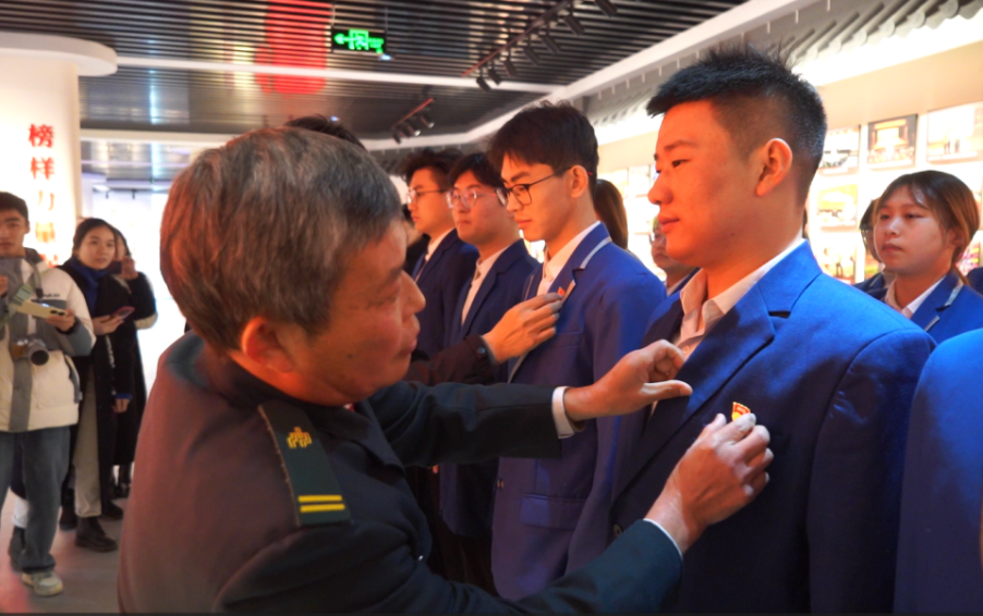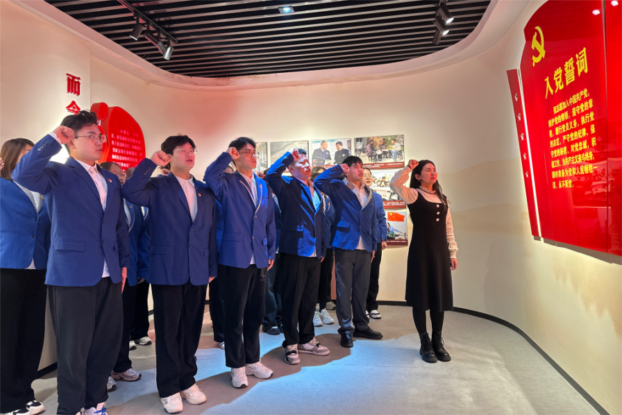 在唐真亚工作室,唐真亚同志、会计学院党总支书记罗斌、副书记方书论等为新发展党员佩戴党员徽章,并带领新发展党员进行入党宣誓,希望他们时刻对自己高标准、严要求,积极发挥党员的模范带头作用。