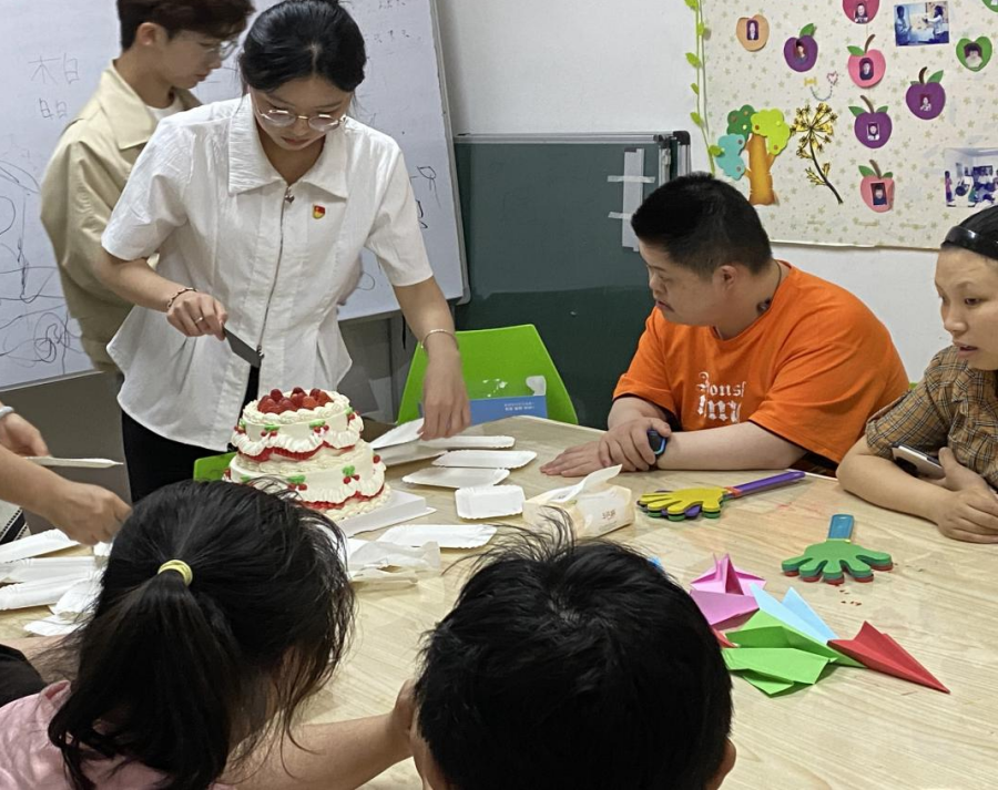 情暖童心,共沐党的温暖。“小朋友们,六一儿童节快乐!”服务中心内,智力残疾人士们正在工作人员的指导下进行日常的训练和活动,当孩子们看到志愿者们的到来时,他们纷纷露出了惊喜的表情。活动中,志愿者们带领同学们一起合唱了《小星星》《两只老虎》等欢乐的歌,并且一起分享蛋糕,共庆“六一”集体生日。这时,有一位同学主动提出想唱《感恩的心》,最后在一声声“下次见”中,结束了这次志愿活动。