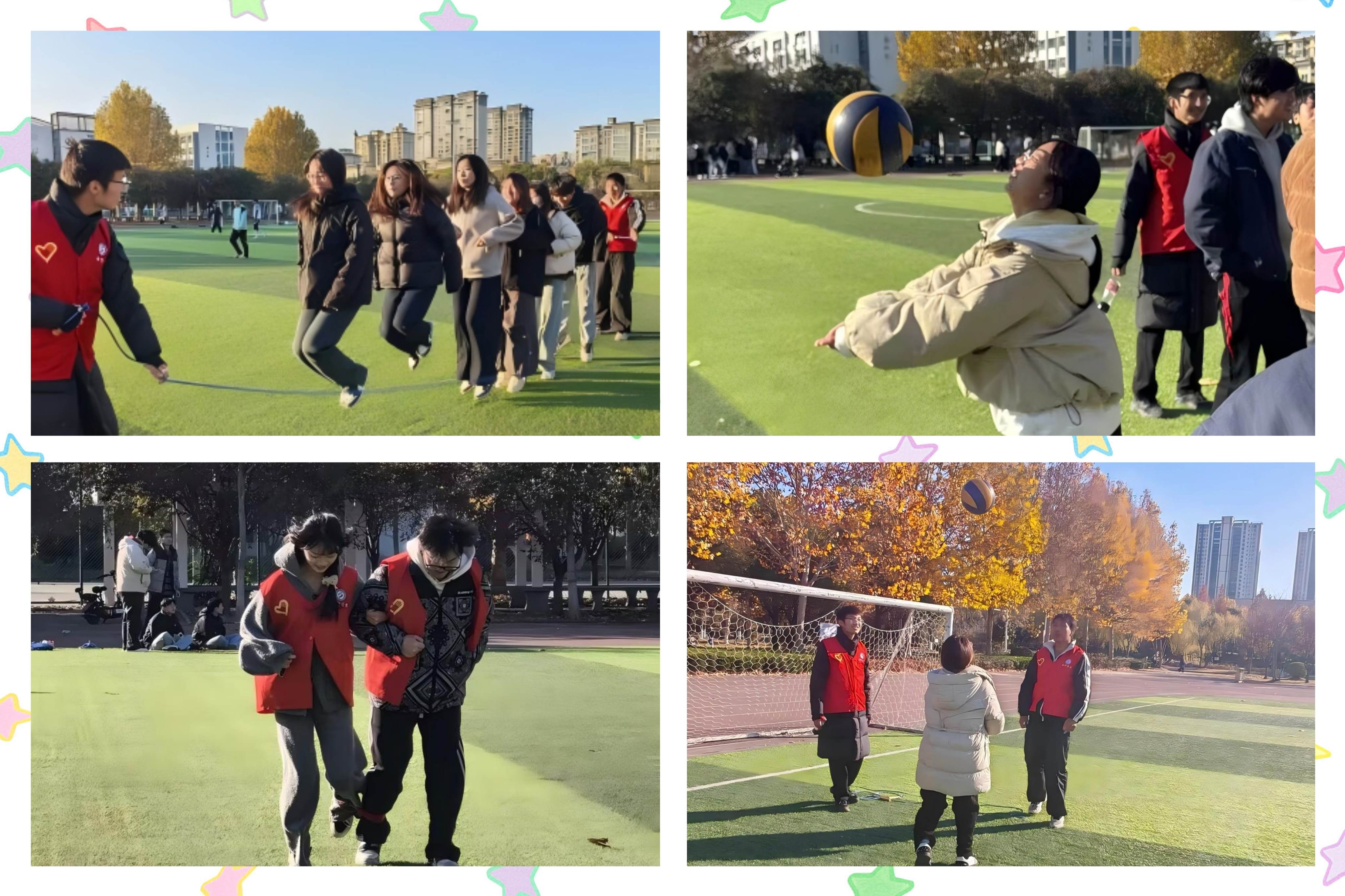 活动以“盲盒抽卡 + 团队任务” 为核心形式,将参与同学划分为若干小组,每组 6 人依次抽取盲盒任务卡,解锁指定挑战。现场设置两人三足、集体跳绳、趣味颠排球等强互动性项目,既让同学们在协作闯关中考验团队默契、感受集体力量,又在趣味运动中强健体魄、舒缓身心。