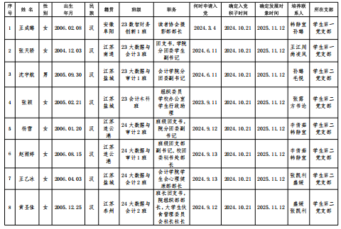 为增强党员发展工作透明度,强化监督作用,确保新党员质量,特将王成璐、张天骄等8名同志情况予以公示,公示时间2025年12月5日—2025年12月11日。在公示期限内,欢迎广大党员群众,通过信函、电话或直接来访反映问题。