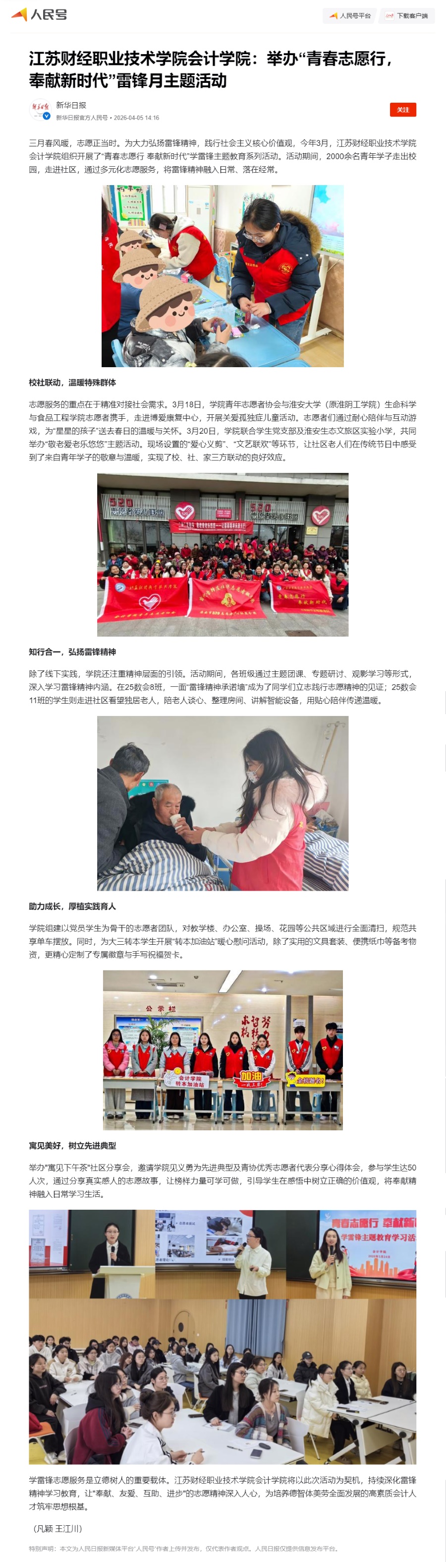 学雷锋志愿服务是立德树人的重要载体。江苏财经职业技术学院会计学院将以此次活动为契机,持续深化雷锋精神学习教育,让"奉献、友爱、互助、进步"的志愿精神深入人心,为培养德智体美劳全面发展的高素质会计人才筑牢思想根基。