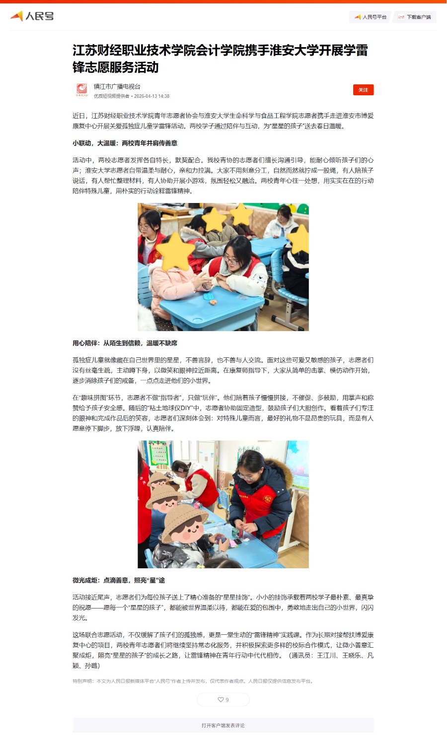 近日,江苏财经职业技术学院青年志愿者协会与淮安大学生命科学与食品工程学院志愿者携手走进淮安市博爱康复中心开展关爱孤独症儿童学雷锋活动。两校学子通过陪伴与互动,为“星星的孩子”送去春日温暖。