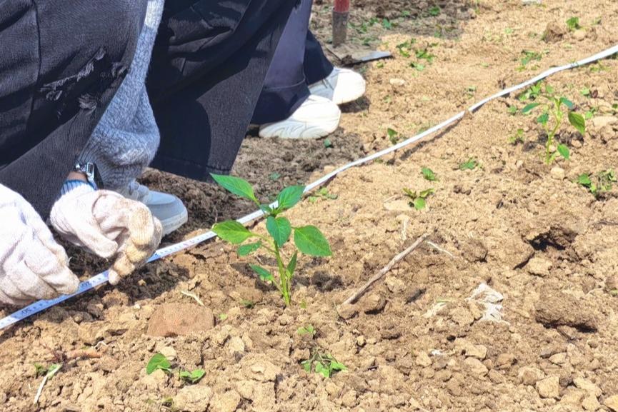 随着“开工”号令响起,同学们迅速组成劳动小组,在技术员的指导下有序开展作业。第一小组负责整地翻土,男生们挥动锄头破开板结土层,女生们用钉耙细筛土块;第二小组开展“地毯式”除草行动,蹲身拔除混在土中的杂草根系,连石缝间的顽固杂草也不放过;第三小组承担播种重任,辣椒和茄子幼苗则带着原土轻轻移栽。