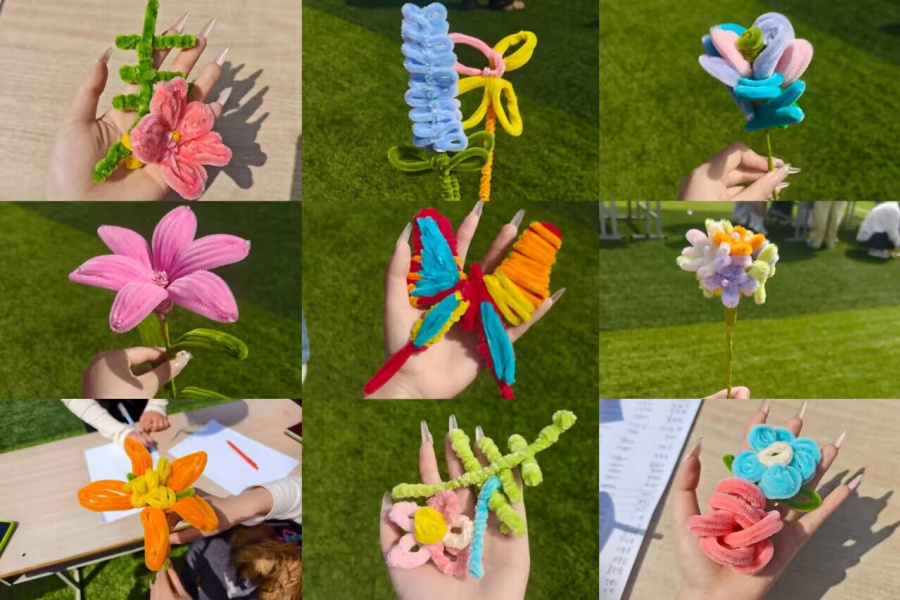 活动伊始,同学们在现场领取了包含扭扭棒、剪刀、装饰配件等材料的工具包,随即展开自由创作。大家或独自构思,或三两结伴讨论,结合在校园中观察到的花朵、蝴蝶、新芽等春日景象,充分发挥想象力。一根根色彩缤纷的扭扭棒,经过弯折、缠绕、拼接等操作,被制作成栩栩如生的花束、灵动可爱的小动物挂件、富有意境的装饰画等多种形式的作品。这些色彩斑斓的扭扭棒作品,不仅定格了春日校园的生机与活力,也记录了同学们在动手实践中收获的快乐。