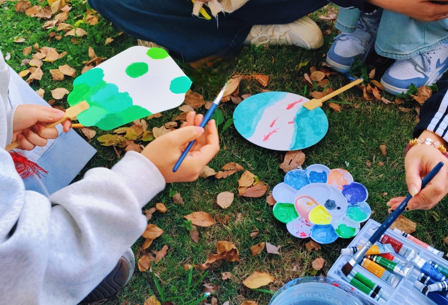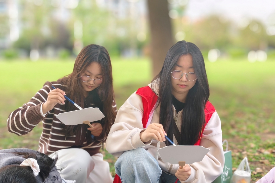 读书分享结束后,同学们拿起画笔,在空白团扇上书写个人愿景与读书感悟,或描绘心中的春日图景。画笔在团扇上留下斑斓色彩。清风徐来,扇底生风,书香与墨香交织成这个午后最温柔的注脚。